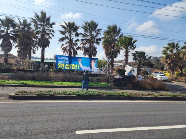야자수 농원에 이색적으로 현수막을 부착한 원성현 후보